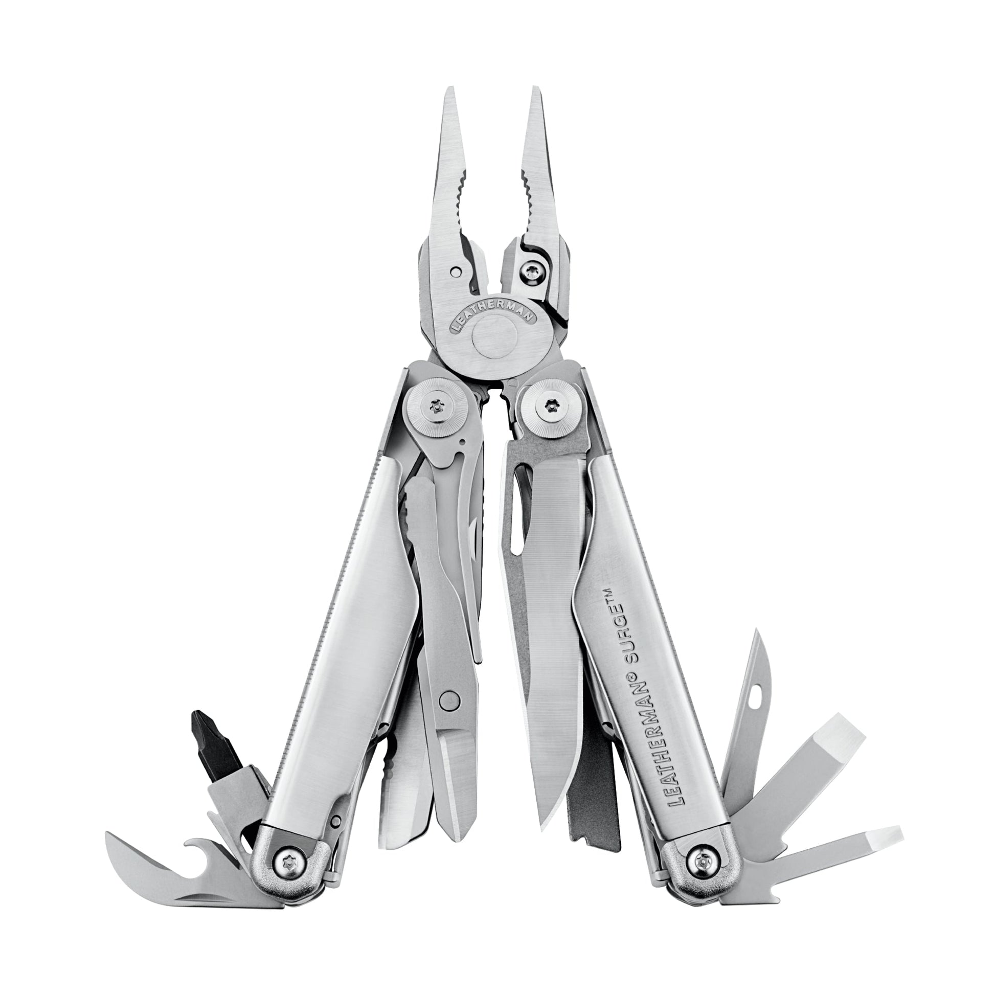 The Leatherman Surge is one of our two largest multi-tools; a real powerhouse, built with our largest pliers, longest multi-tool blades and easy-to-use locks. A unique blade exchanger, replaceable premium wire cutters and four outside-opening blades give you quick access to the tools you use most. The Surge was built for tough jobs and the hands that do them. Sheath sold separately.